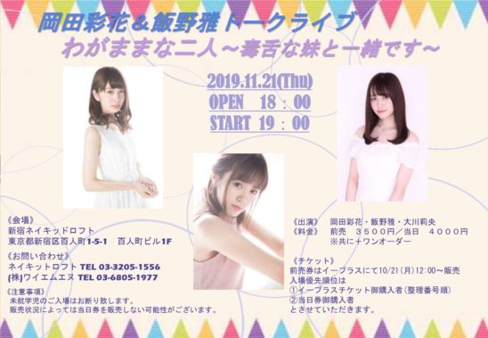 SCHEDULE 2019 11 21 Thursday 岡田彩花&飯野雅トークライブ わがままな二人 〜毒舌な妹と一緒です〜 OPEN 18:00 - START 19:00 Tweet 【出演】 岡田彩花・飯野雅・大川莉央 TICKET前売¥3500 (要1オーダー¥500以上)※e +にて10/21(月)12時より発売開始!Thank You SoldOut!!※当日券の販売はございません。 Share