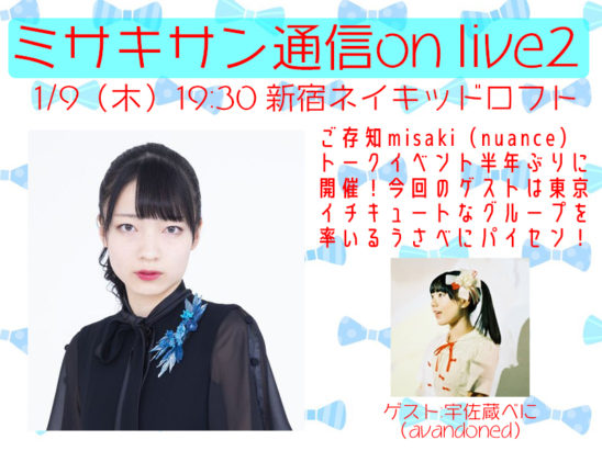 ミサキサン通信on liveが半年ぶりに帰ってきた!前回は絶対忘れるなの志賀ラミー・セルラ伊藤をゲストにラップ話に仮ぜわすネーム“ポニーテILL”を与えられたり時間オーバートークで超盛り上がり!今回のゲストはavandonedプレイングプロデューサー・宇佐蔵べに!東京一キュートなグループを率いるうさべにパイセンに、misakiがどう切り込むのかお楽しみに。今回のミサキサン通信はILLなのかCHILLなのか?! もちろん弾き語りもあり!