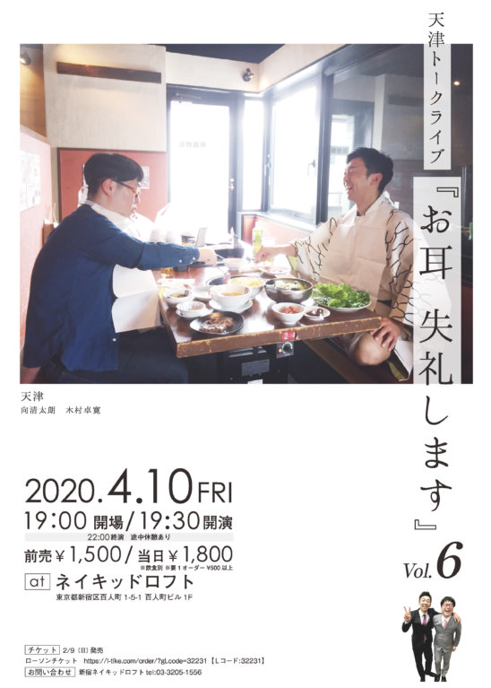 4月10日(金)に開催を予定しておりました、天津トークライブ『お耳 失礼しますVol.6』は、 感染症拡大の防止及びお客様、出演者様、スタッフの安全を考慮し、誠に残念ながら開催を中止とさせていただきます。