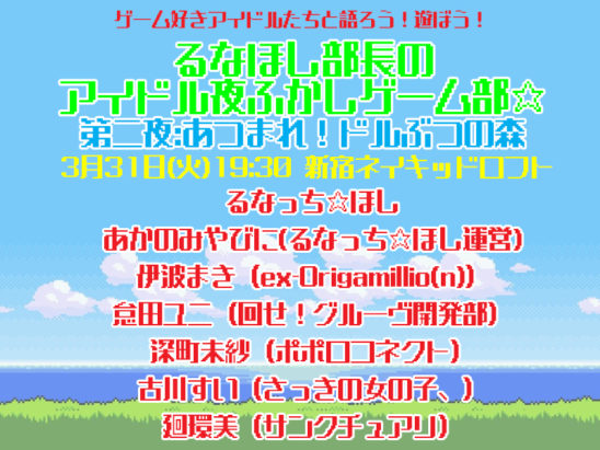 ゲーム好きアイドルの自宅ノリを現場で再現した「るなほし部長のアイドル夜ふかしゲーム部☆」第二夜決定!前回は深夜イベントでしたが今回は真っ当な夜イベント。それぞれのゲーム話をたっぷりしちゃいます!もちろん発売直後の「どうぶつの森」トークにも花を咲かせますよ!アイドルのお部屋公開ならぬゲーム内お部屋公開も!?