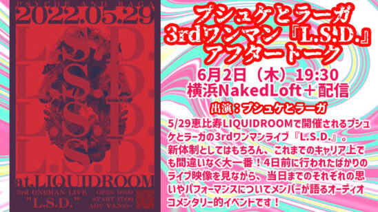5/29恵比寿LIQUID ROOMで開催されるプシュケとラーガの3rdワンマンライブ『L.S.D.』。新体制としてはもちろん、これまでのキャリア上でも間違いなく大一番!