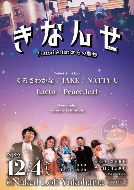 現段階でイベント予算も無い弱小中の弱小イベントですが、将来的に地元鳥取で活躍してるアーティストが関東でライブが出来るキッカケとなるイベントにも育てて行きたいと思ってます!
