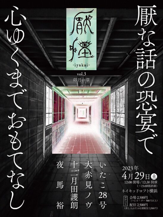 今回は、オールジャンルを変幻自在に語り尽くす、怪談界の暴れ獅子「いたこ28号」、強烈なエピソードを多数持つ今最もアツい語り手、大人気ナナフシギの「大赤見ノヴ」、怪談最恐戦2022ファイナリストにして、濃厚な語りで注目の怪談師「十二月田護朗」、そして厭な話をこよなく愛する怪談師「夜馬裕」の4名で、怖くて厭なら“なんでもアリ”の【厭怪】を150分濃密に語ります!