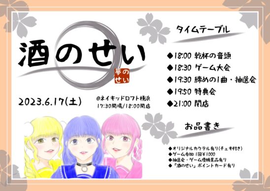 SCHEDULE 2023 06 17 Saturday 酒のせい Vol.1 OPEN 17:30 - START 18:00 Tweet 【出演】youmenosay みんなでワイワイお酒を飲んだりゲームをしたりするゆる〜いイベント.ᐟ.ᐟ 気軽に集まれ〜💨 TICKET◎会場チケット 会場¥ 500(要2オーダー) ご入場順はウェブ予約→当日券となります。 Share このイベントの予約は締めきりました。