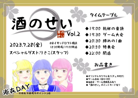 SCHEDULE 2023 07 28 Friday 酒のせい Vol.2 OPEN 18:30 - START 19:00 Tweet 【出演】youmenosay みんなでワイワイお酒を飲んだりゲームをしたりするゆる〜いイベント.ᐟ.ᐟ 気軽に集まれ〜💨 TICKET◎会場チケット 会場¥ 500(要2オーダー) ご入場順はウェブ予約→当日券となります。 Share このイベントの予約は締めきりました。