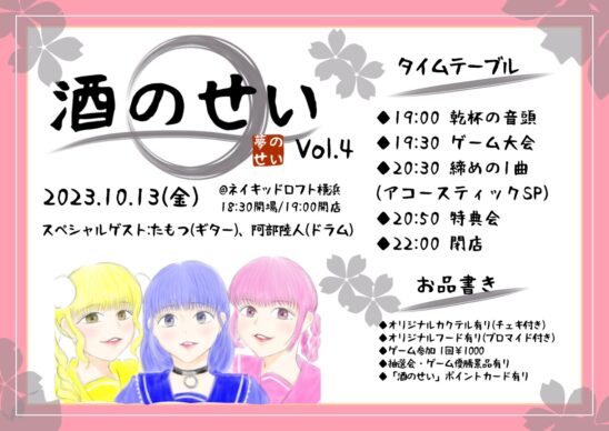 SCHEDULE 2023 10 13 Friday 酒のせい Vol.4 OPEN 18:30 - START 19:00 Tweet 【出演】youmenosay みんなでワイワイお酒を飲んだりゲームをしたりするゆる〜いイベント.ᐟ.ᐟ 気軽に集まれ〜💨 TICKET◎会場チケット 会場¥ 500(要2オーダー) ご入場順はウェブ予約→当日券となります。 Share このイベントの予約は締めきりました。