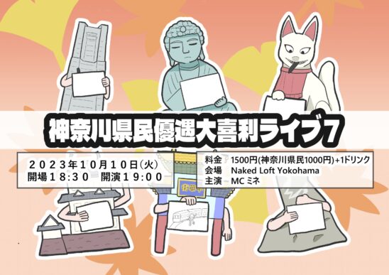 秋の味覚よりも神奈川での大喜利!!毎度好評、終演後のBARタイムなど余すところのないライブです。お楽しみに!