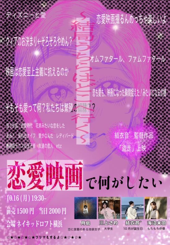 恋愛映画を撮ったことがある学生監督2人、恋に含蓄のある池袋女子・月島の3人で恋愛映画について、きっとものすごく自分を出しながらおしゃべりします!