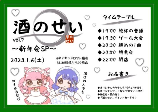 SCHEDULE 2024 01 06 Saturday 酒のせい vol.7〜新年会SP 〜 OPEN 18:30 - START 19:00 Tweet 【出演】youmenosay みんなでワイワイお酒を飲んだりゲームをしたりするゆる〜いイベント.ᐟ.ᐟ 気軽に集まれ〜💨 TICKET◎会場チケット 会場¥ 500(要2オーダー) ご入場順はウェブ予約→当日券となります。 Share このイベントの予約は締めきりました。