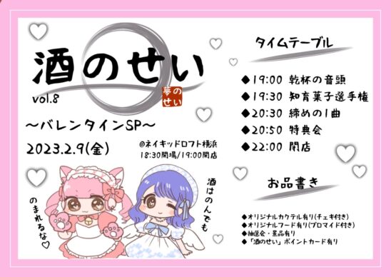 SCHEDULE 2024 02 09 Friday 酒のせい vol.8〜バレンタインSP〜 OPEN 18:30 - START 19:00 Tweet 【出演】youmenosay みんなでワイワイお酒を飲んだりゲームをしたりするゆる〜いイベント.ᐟ.ᐟ 気軽に集まれ〜💨 TICKET◎会場チケット 会場¥ 500(要2オーダー) ご入場順はウェブ予約→当日券となります。 Share このイベントの予約は締めきりました。