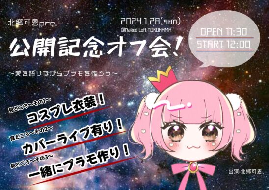 SCHEDULE 2024 01 28 Sunday DAY EVENT 北郷可恩pre. 「公開記念オフ会!〜愛を語りながらプラモを作ろう〜」 OPEN 11:30 - START 12:00 Tweet 【出演】北郷可恩 TICKET◎会場チケット ¥ 3,000 (※要1オーダー500円以上) ※ご入場順はウェブ予約→当日券 Share このイベントの予約は締めきりました。