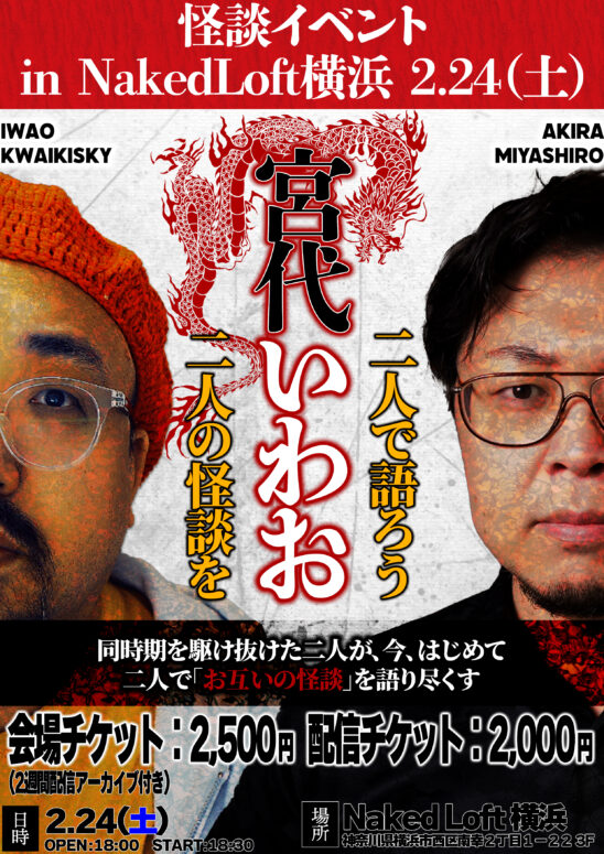 宮代あきらと怪談恐不知 いわおカイキスキーが、お互いの怪談を提供し合い、お互いで語り合う、盟友だからこそできるイベントをお届けします。