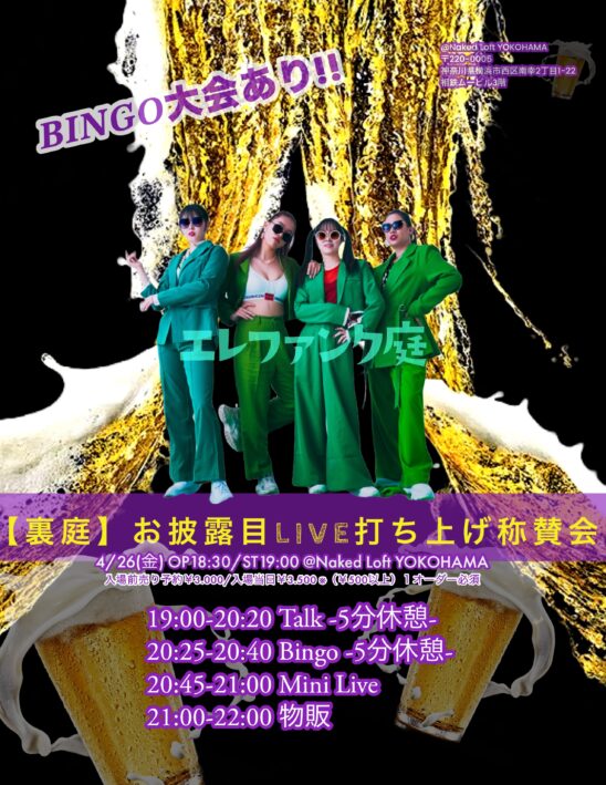 SCHEDULE 2024 04 26 Friday お披露目LIVE打ち上げ称賛会 OPEN 18:30 - START 19:00 Tweet 【出演】エレファンク庭 TICKET◎会場チケット 入場前売り予約¥3,000・入場当日¥3,5001オーダー必須(¥500以上) ご入場順はウェブ予約→当日券となります。 Share このイベントの予約は締めきりました。