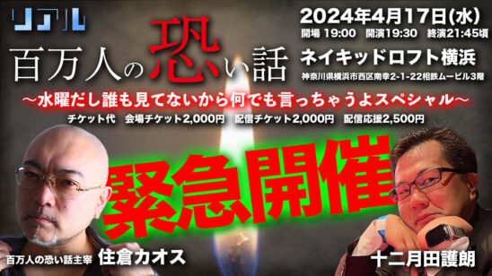 怪談界の重鎮であり、プロ猥談家でもある住倉カオスのYouTube「百万人の恐い話」リアルイベント!