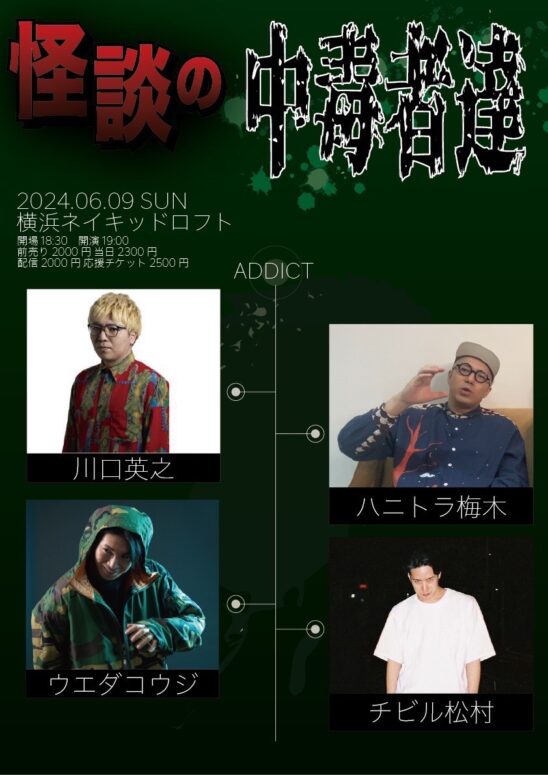 川口英之、ハニトラ梅木、ウエダコウジ、チビル松村の怪談中毒者4人による怪談会。