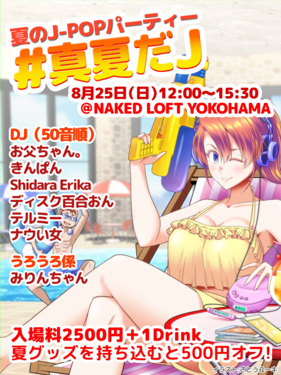 SCHEDULE 2024 08 25 Sunday DAY EVENT 夏のJ-POPパーティー #真夏だJ OPEN 12:00 オープン&スタート - Tweet DJ: お父ちゃん。 きんぱん Shidara Erika ディスク百合おん テルミー ナウい女 (50音順) うろうろ係: みりんちゃん TICKET入場料2500円+1Drink 夏グッズ持ち込みで500円OFF! ※水鉄砲・ウォーターガンもOKですが、会場使用は厳禁です Share このイベントの予約は締めきりました。