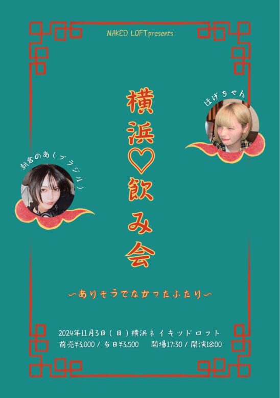 SCHEDULE 2024 11 03 Sunday NAKED LOFTpresents 横浜♡飲み会 ~ありそうでなかったふたり~ OPEN 17:30 - START 18:00 Tweet 【出演】新倉のあ(ブラジル)、ほげちゃん(五十音順) ネイキドロフトで横浜♡飲み会開催決定! 今回の飲みトーク仲間はブラジルちゃんとほげちゃんです! 飲みながら色々と歌ったりお話ししましょ♡ TICKET前売り¥ 3,000(※要1オーダー500円以上) ※チケットは10/12(土)12:00より発売開始 ※ご入場順はLivepocketチケット整理番号順 Thank you SOLD OUT !!当日券の発売はございません。 ※チケット決済後のキャンセルは出来ませんのでご注意ください。 Share