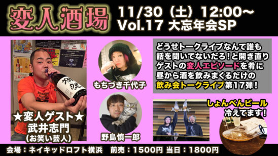 ライターのもちづき千代子と野島慎一郎が変人ゲストを招き、その変人エピソードを肴にステージ上で酒を飲む“飲み会トークライブ”企画。