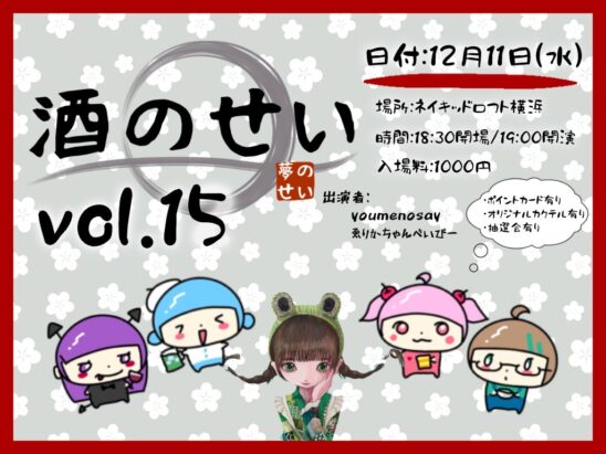 SCHEDULE 2024 12 11 Wednesday 酒のせい vol.15 OPEN 18:30 - START 19:00 Tweet 【出演】youmenosay 【ゲスト】ゑりかちゃんべいびー みんなでワイワイお酒を飲んだりゲームをしたりするゆる〜いイベント.ᐟ.ᐟ 気軽に集まれ〜💨 TICKET◎会場チケット 会場¥ 1,000(要2オーダー) ご入場順はウェブ予約→当日券となります。 Share このイベントの予約は締めきりました。