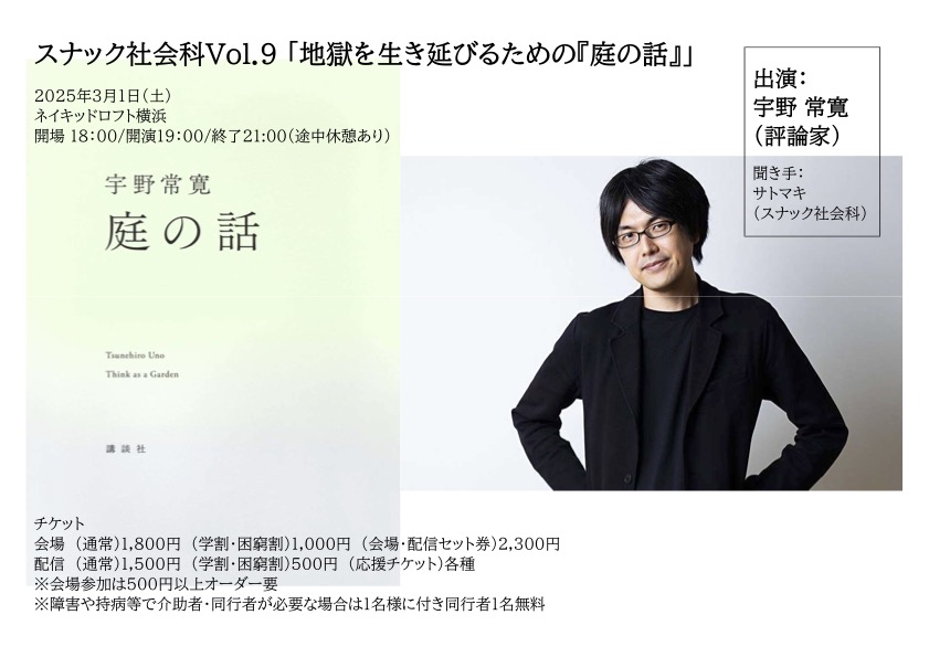 2025年、最初のスナック社会科は昨年12月に『庭の話』を刊行された評論家の宇野常寛さんをお招きします!なんともう3刷り(1月時点)、すごい。