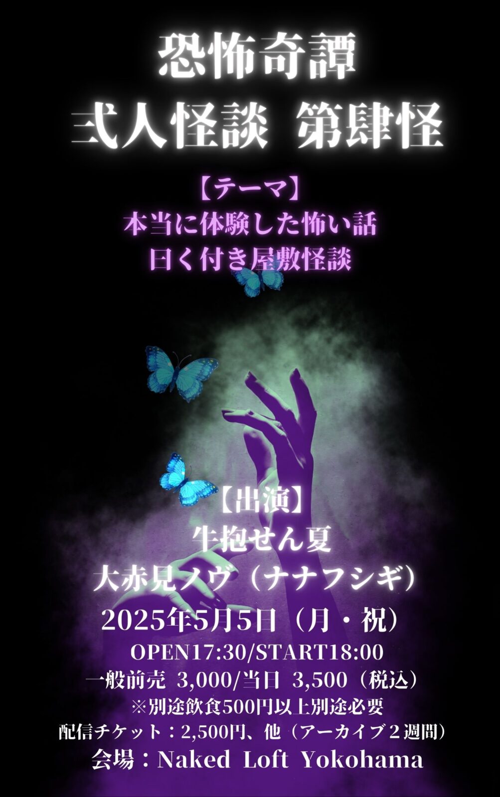 第肆怪の出演者は2010年怪談グランプリを優勝し、古典怪談でも有名な『牛抱せん夏』と絶対に調べてはいけない名字を持つ呪われし家系の男『大赤見ノヴ』が軽妙な語り口で語る恐怖の世界「本当に体験した怖い話と曰く付き屋敷怪談」をテーマにじっくり怪談を語ります。
