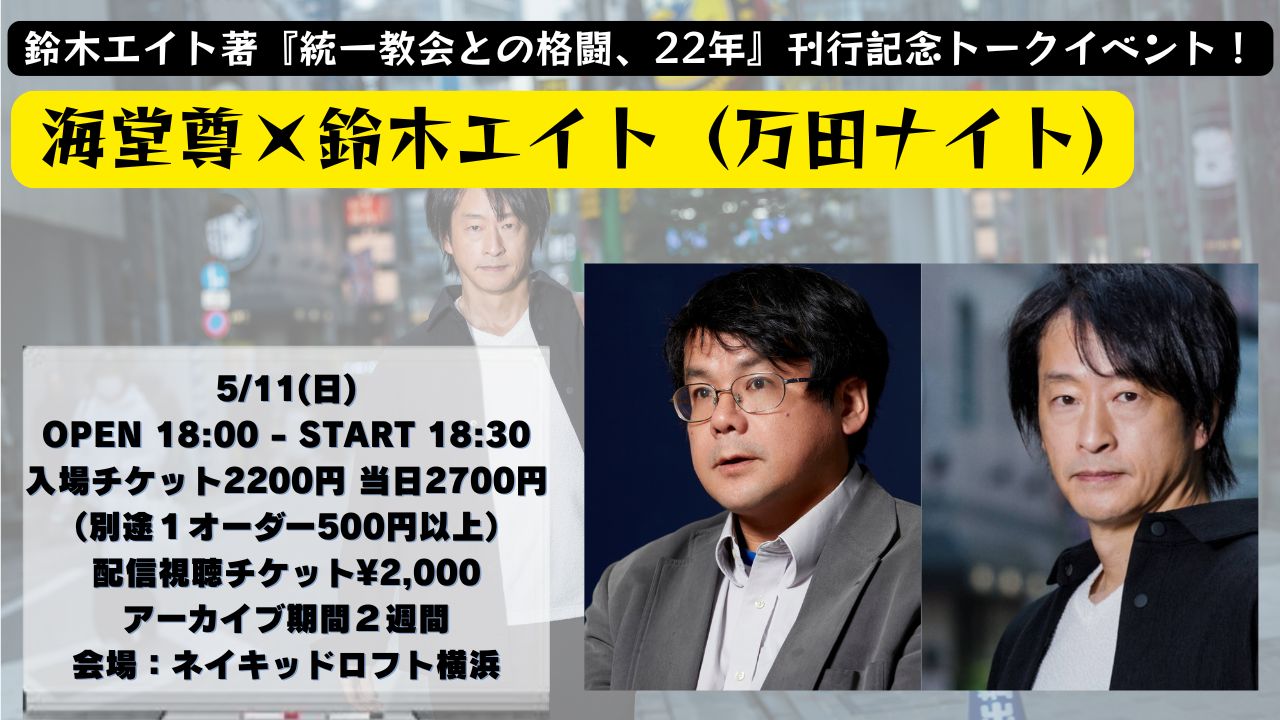 解散命令が出された統一教会との22年にわたる暗闘を描いた話題作『統一教会との格闘、22年』(角川新書)を発刊した鈴木エイトが、ベストセラー作家の海堂尊氏(最新刊「蘭医繚乱 洪庵と泰然」( PHP研究所)、チーム・バチスタシリーズ最新刊 『プラチナハーケン1980』(講談社))を特別ゲストに迎えて、トークイベントを開催!