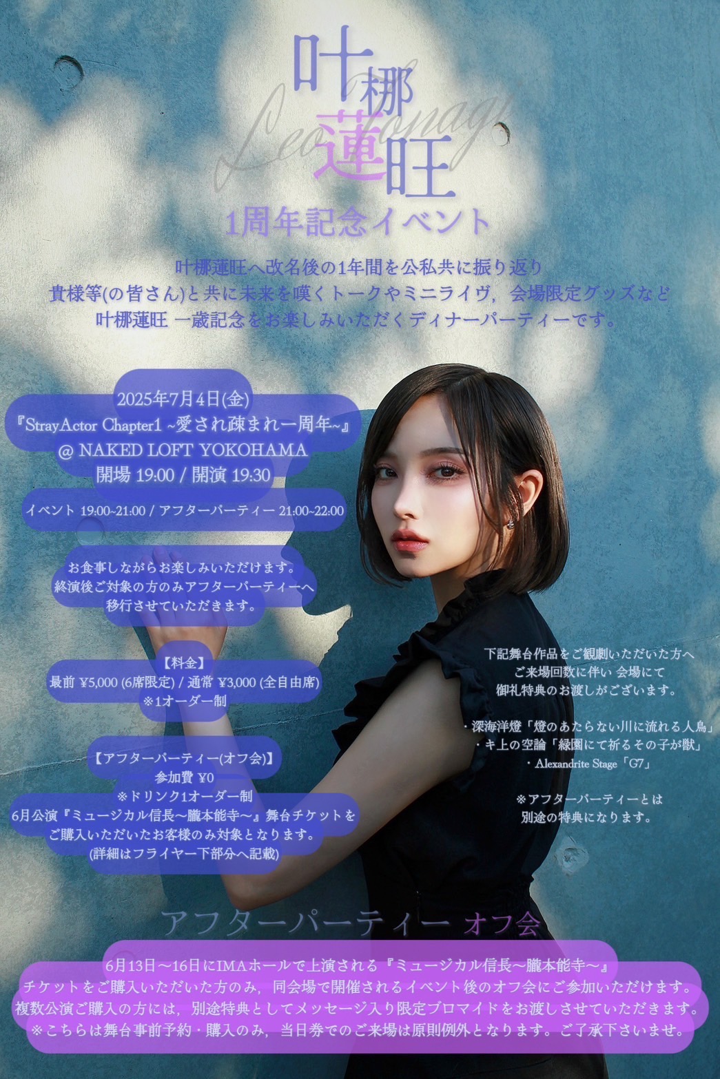 参加条件:7/4ネイキッドロフト開催の「叶梛蓮旺1周年記念イベント StrayActor Chapter 1 愛され 疎まれ一周年」に来場の方で、6月公演『ミュージカル信長〜朧本能寺〜』の舞台チケットを事前予約・ご購入いただいたお客様のみ対象となります。