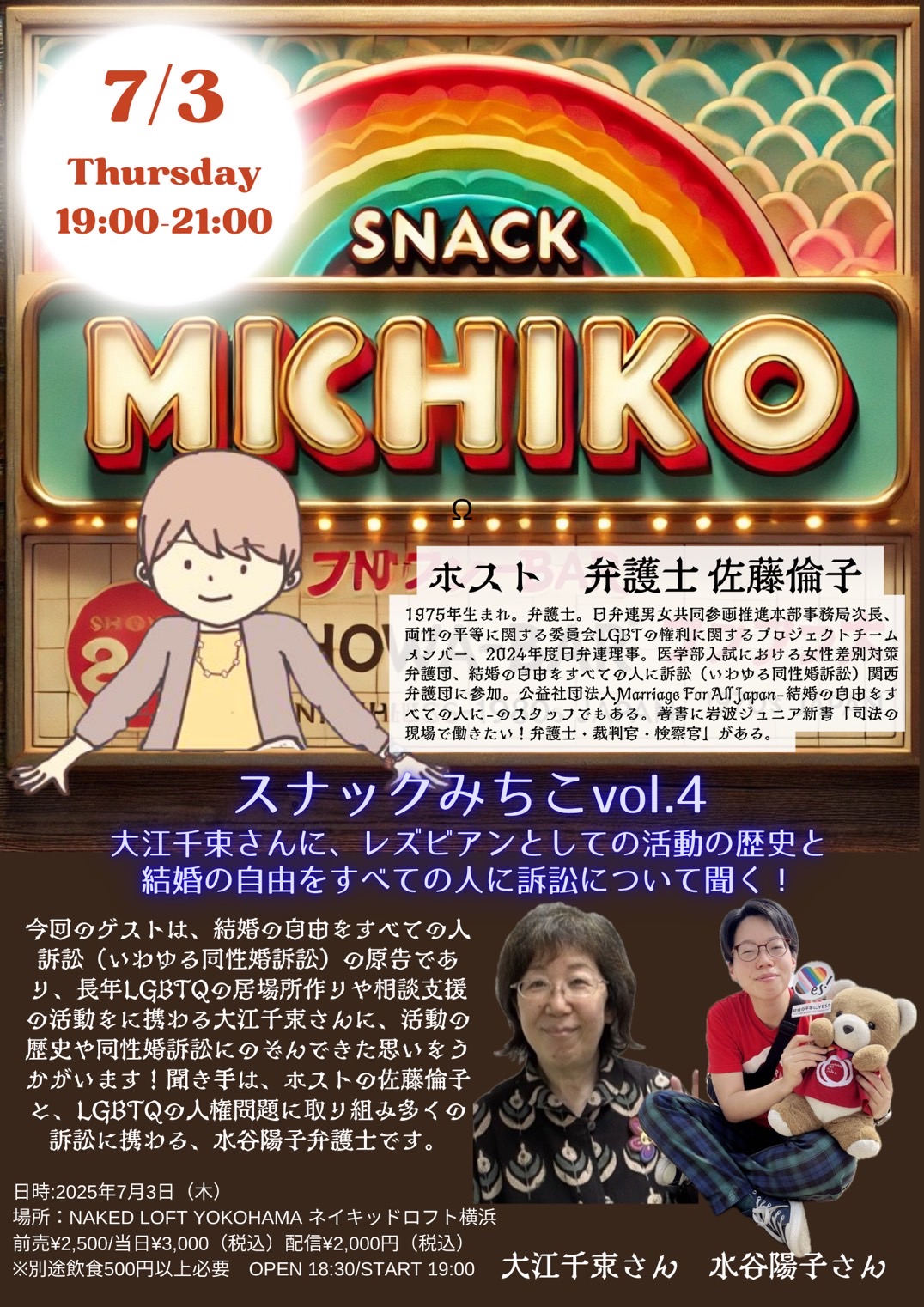 4回目となるスナックみちこ。今回は、結婚の自由をすべての人訴訟(いわゆる同性婚訴訟)の原告であり、長年LGBTQの居場所作りや相談支援の活動をに携わる大江千束さんに、活動の歴史や同性婚訴訟にのぞんできた思いをうかがいます!聞き手は、ホストの佐藤倫子と、LGBTQの人権問題に取り組み多くの訴訟に携わる、水谷陽子弁護士です。濃厚な二時間になること間違いなしです!ぜひ横浜にお越しください!