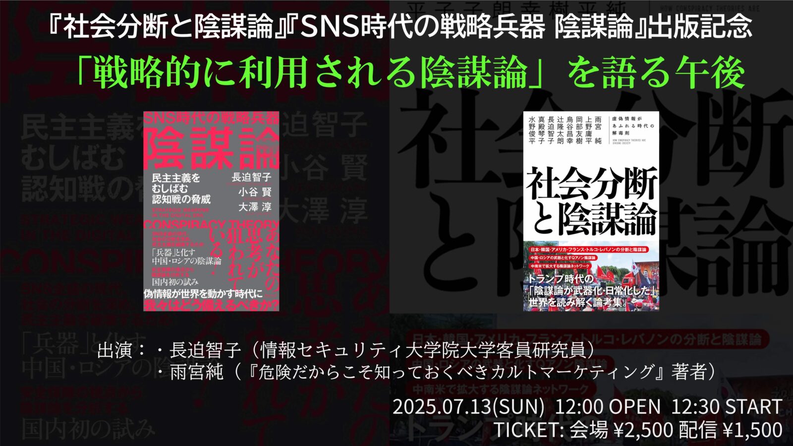 この出版記念イベントでは、認知戦についての論考を両書に寄稿している長迫智子氏と、陰謀論ビジネスの観点を取り入れた論考を『社会分断と陰謀論』に寄稿した雨宮純が、陰謀論に影響されてしまう我々の認知や、それを利用する人々の生態について論じ合います!