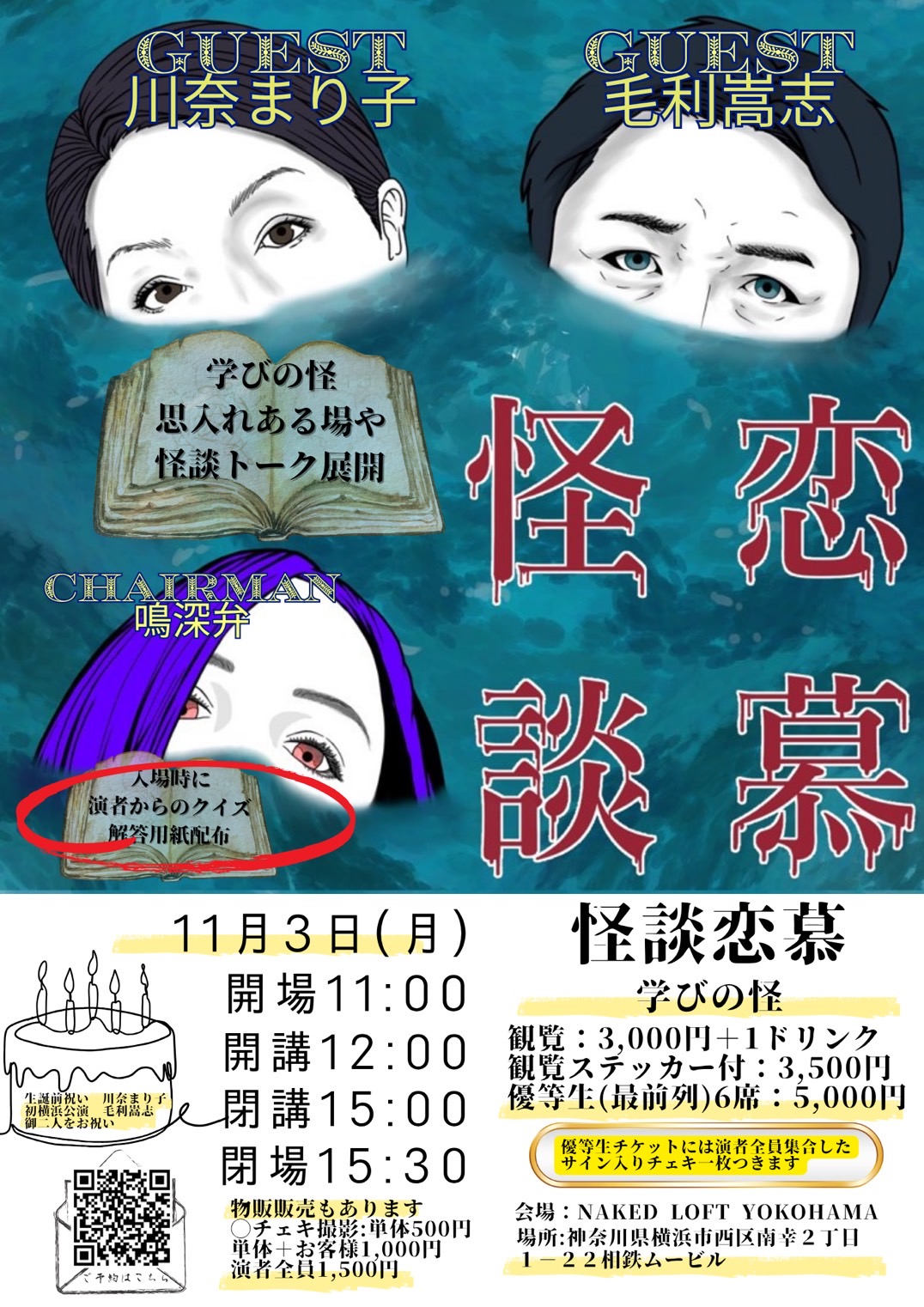 怪談ユニットが多い昨今ですが、メンバー全員が最恐の語り手ユニット「怪談恐不知」の一員である毛利嵩志先生を初横浜にお迎えしました!