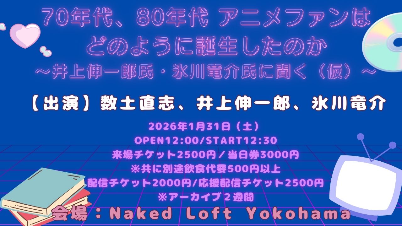 ゲストは70年代からアニメ雑誌の編集・編集長などを務め、その後角川書店代表取締役社長、KADOKAWA代表取締役副社長も歴任した井上伸一郎さん、アニメ特撮研究家の氷川竜介さん。