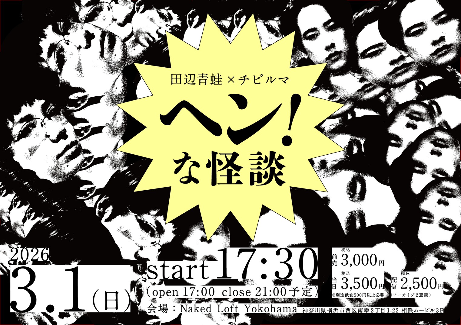 怪談師・チビルマと小説家・田辺青蛙が、「ヘン!」をテーマに、変な話だけを語り尽くす夜。日常の隙間から覗く、誰も見たことのない奇妙な世界。
