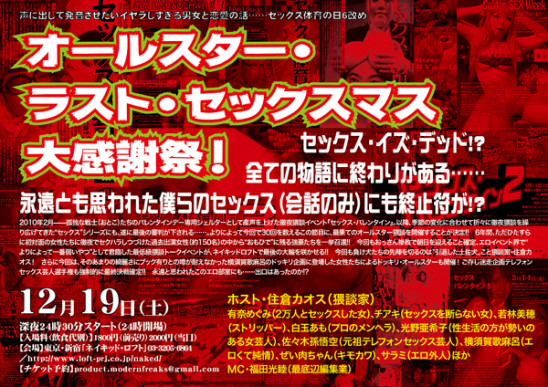 2010年2月――孤独な戦士(おとこ)たちのバレンタインデー専用シェルターとして産声を上げた徹夜猥談イベント『セックス・バレンタイン』。以降、季節の変化に合わせて折々に徹夜猥談を繰り広げてきた“セックス”シリーズにも、遂に最後の審判が下される……。