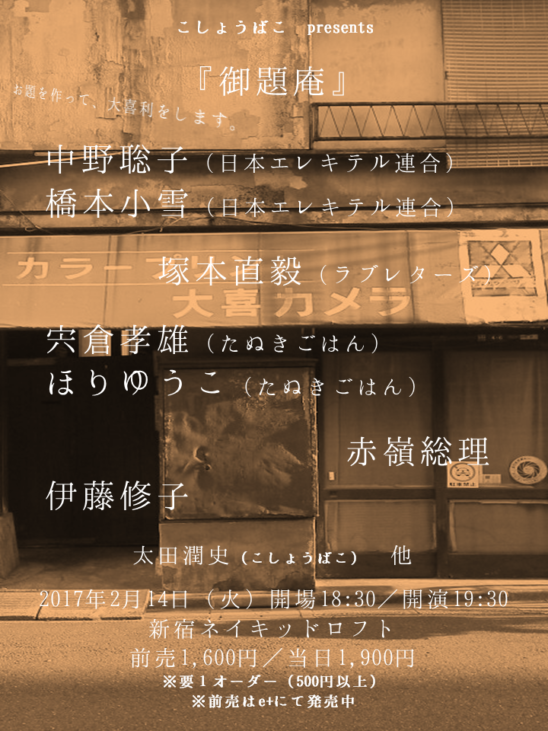 SCHEDULE 2017 02 14 Tuesday こしょうばこ presents 『御題庵』 OPEN 18:30 - START 19:30 Tweet まず、お題を作ります。 それで、出来たお題で大喜利をします。 自給自足の大喜利ライブです。 【出演】 中野聡子(日本エレキテル連合) 橋本小雪(日本エレキテル連合) 塚本直毅(ラブレターズ) 宍倉孝雄(たぬきごはん) ほりゆうこ(たぬきごはん) 伊藤修子 赤嶺総理 太田潤史(こしょうばこ) 他 TICKET前売¥1600 / 当日¥1900 ※要1オーダー(500円以上) ※前売券はe+にて1月14日(土)12:00発売開始! Share