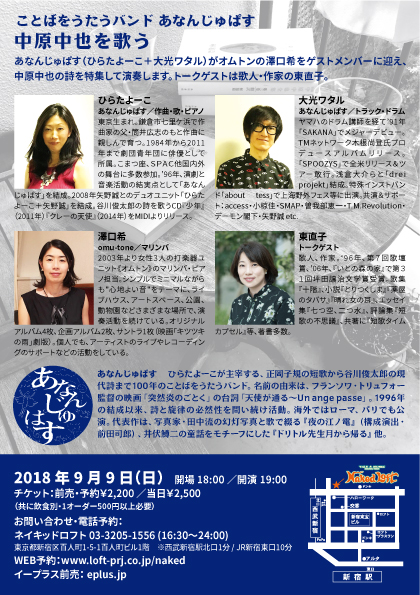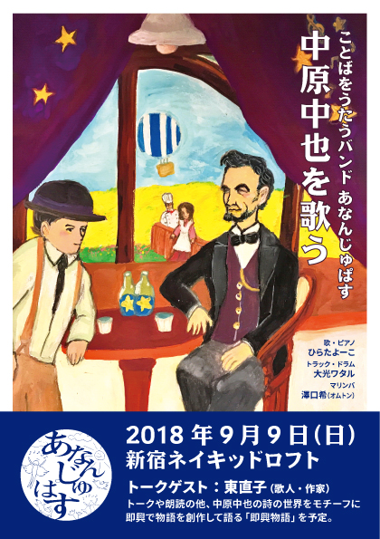 あなんじゅぱす(ひらたよーこ+大光ワタル)がオムトンの澤口希をゲストメンバーに迎え、中原中也の詩を特集して演奏します。ゲストは歌人・作家の東直子。トークや朗読の他、中原中也の詩の世界をモチーフに即興で物語を創作して語る「即興物語」を予定しています。ご期待ください。