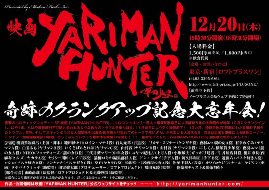 衝撃のエロティックコメディーSF映画『YARIMAN HUNTER』——エロコントオンリー芸人=横須賀歌麻呂による構想5年の大問題作が昨年10月にクランクインし、はや1年。もはや撮影続行不可能と思われるような数々のトラブルを乗り越え、11月末日にようやく撮影終了! 13カ月、撮影日数20日間にわたる撮影で起きたトラブル、抗争、そしてスキャンダラスな人間関係を出演者・制作陣入り乱れてのトークで洗いざらいぶちまける大忘年会!! 当日は出演女優陣による撮影コーナー、Tシャツ・情報掲載雑誌の物販、そしてなんといっても最新予告映像の公開も!!! 重荷を卸した『YARIMAN HUNTER』関係者と乾杯しましょう!
