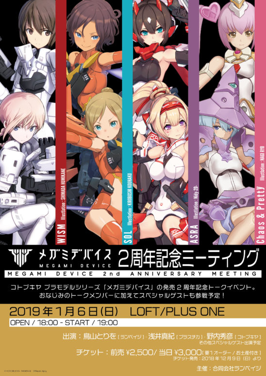 SCHEDULE 2019 01 06 Sunday メガミデバイス 2周年記念ミーティング OPEN 18:00 - START 19:00 Tweet コトブキヤ プラモデルシリーズ「メガミデバイス」の発売2周年記念トークイベント。 おなじみのトークメンバーに加えてスペシャルゲストも参戦予定! 【出演】 鳥山 とりを(ランペイジ) 浅井 真紀(プラスチカ) 野内 秀彦(コトブキヤ) + 特別ゲスト TICKET前売¥2,500(要1オーダー・お土産付き) ※お土産は当日お渡し 前売りはe+にて12/9(日)12:00より発売開始 前売りSOLD OUT!!当日券は御座いません。 Share