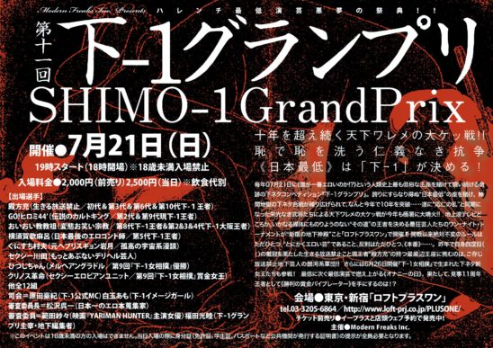 毎年07月21日に《誰が一番エロいのか!?》という人類史上最も低俗な王座を賭けて闘い続ける奇跡の下ネタコンペティション『下ー1グランプリ』。誇りにすらなり得ぬ“日本最低”の座を賭け、無間地獄の下ネタ合戦が繰り広げられて、なんと今年で10年を突破……遂に“応仁の乱”と同期になった栄光なき武将たちによる天下ワレメの大ケッ戦が今年も極暑に大噴火!! 地上波テレビどころか、いかなる媒体にものりようのない“その道”の王者を決める最狂芸人たちのワン・ナイト・トーナメントが“新宿の地下神殿”こと「ロフトプラスワン」で開催!!! 開戦以来絶対不変のルールはただひとつ、“とにかくエロい芸”であること、反則はただひとつ、《本番》……。昨年で自身四度目(!)の戴冠を果たした生きる放送禁止こと現王者“殿方充”の持つ最底辺王座に挑むのは、ご存じ放送禁止地下芸人の銀河系軍団!! さらには6月26日開催『下ー1女相撲』で生まれた下ネタ新女王たちも参戦! 最低に次ぐ最低演芸で燃え上がる《オナニーの日》、果たして、見事11周年王者として《勝利の黄金バイブレーター》を手にするのは!?