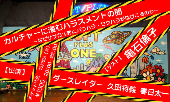 映画配給会社であるアップリンクや現代アート集団のカオスラウンジなど、なぜサブカル界にパワハラ・セクハラがはびこるのだろうか。そしてそれはサブカル特有のものなのか、カルチャー界全般で言えるものなのだろうか。各カルチャーに精通する出演者たちにゲストの亀石さんを交え、ハラスメントが起きてしまう構造を深く掘り進めるイベントが、数々の事件を起こしてきたロフトプラスワンで開催決定!!