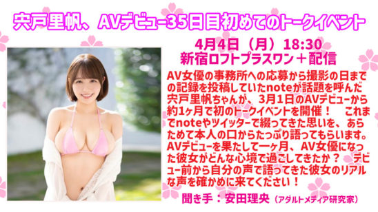 AV女優の事務所への応募から撮影の日までの記録を投稿していたnoteが話題を呼んだ宍戸里帆ちゃんが、3月1日のAVデビューから約1ヶ月で初のトークイベントを開催! これまでnoteやツイッターで綴ってきた思いを、あらためて本人の口からたっぷり語ってもらいます。AVデビューを果たして一ヶ月、AV女優になった彼女がどんな心境で過ごしてきたか? デビュー前から自分の声で語ってきた彼女のリアルな声を確かめに来てください!