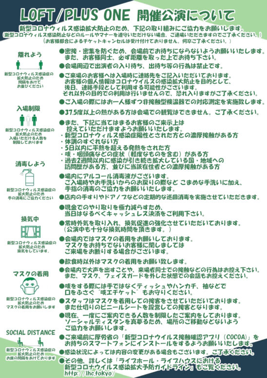 ※その他、詳しくは「ライブホール・ライブハウスにおける新型コロナウイルス感染拡大予防ガイドライン」もご覧ください。