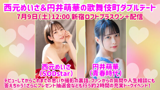 共にアイドル経験がありSODからデビューしたふたり、西元めいさちゃんと円井萌華ちゃんによるスペシャルトークイベント開催です! それぞれのデビューしてからこれまでの思いや撮影の裏話、プライベートについてや、ファンからの質問や人生相談などにも答えちゃう!さらにプレゼント抽選会なども行う約2時間の充実トークイベントです!