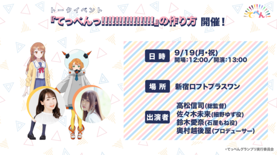 SCHEDULE 2022 09 19 Monday DAY EVENT 『てっぺんっ!!!!!!!!!!!!!!!』の作り方 OPEN 12:00 - START 13:00 Tweet 【出演】 高松信司(総監督)、佐々木未来、鈴木愛奈、奥村越後屋(プロデューサー) 『てっぺんっ!!!!!!!!!!!!!!!』公式サイト TICKET[配信チケット] ¥2,200 ツイキャスにて発売いたします 購入はコチラから! ※配信チケットご購入・アーカイブ視聴は、配信終了後も「期限:9/25(日)23:59」まで可能となります。 [会場チケット] 前売¥3,500(飲食代別) / 当日なし 前売は8/24(水)12:00よりe+にて発売!! 購入はコチラから!(8/23よりアクセスできます) Share