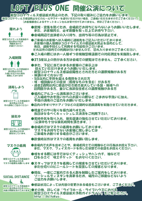 ※その他、詳しくは「ライブホール・ライブハウスにおける新型コロナウイルス感染拡大予防ガイドライン」もご覧ください。