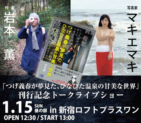 そんなつげ義春作品の魅力の秘密をテーマに、つげ義春のひなびた温泉への偏愛からつげ義春を読み解いた評論本『つげ義春が夢見た、ひなびた温泉の甘美な世界』の著者である作家の岩本薫と、つげ義春の作品をモチーフにセルフポートレート作品を発表している写真家のマキエマキが、縦横無尽に、つげ愛たっぷりに語り合います。