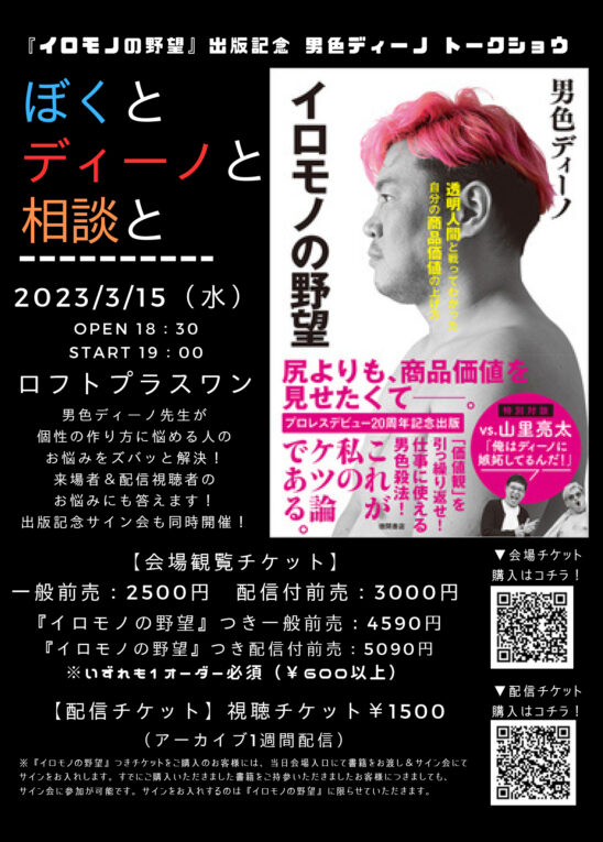 ※『イロモノの野望』つきチケットをご購入のお客様には、当日会場入口にて書籍をお渡し&サイン会にてサインをお入れします。すでにご購入いただきました書籍をご持参いただきましたお客様につきましても、サイン会に参加が可能です。