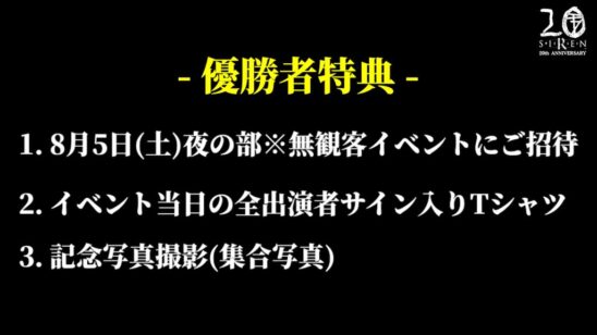 ※最高得点者が複数いた場合、8/5(土)夜「【異界入り万博】-SIREN 20th ANNIVERSARY-夜の部『フィナーレ』」にて優勝決定戦を開催し、優勝者を決めさせていただきます。