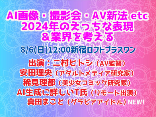 出演:二村ヒトシ(AV監督)、安田理央(アダルトメディア研究家)、稀見理都(美少女コミック研究家)、AI生成に詳しいT氏(リモート出演)、真田まこと(グラビアアイドル)