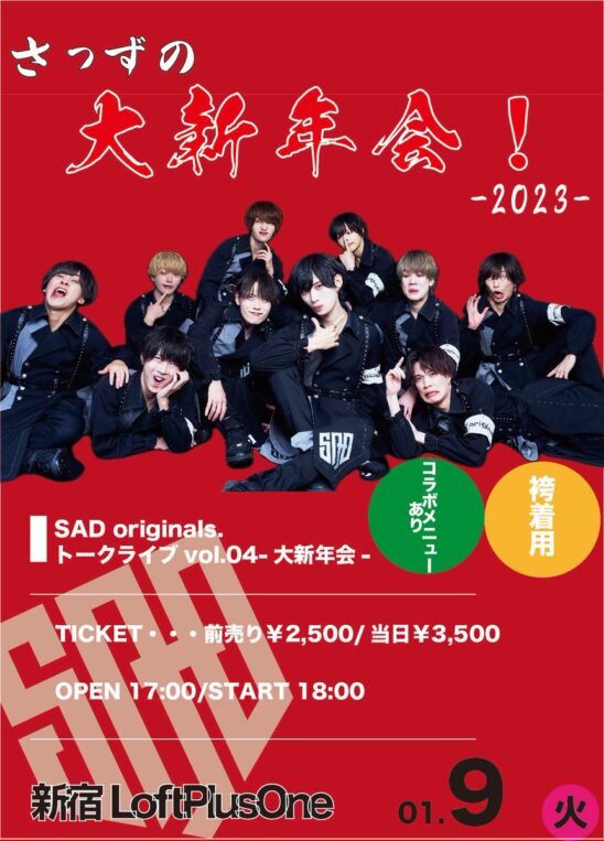 SCHEDULE 2024 01 09 Tuesday SAD originals.トークライブ vol.4-大新年会- Tweet 【出演】SAD originals. TICKETOPEN 17:00 / START 18:00 前売り¥2500/当日¥3500(ドリンク代別途必要になります) Share