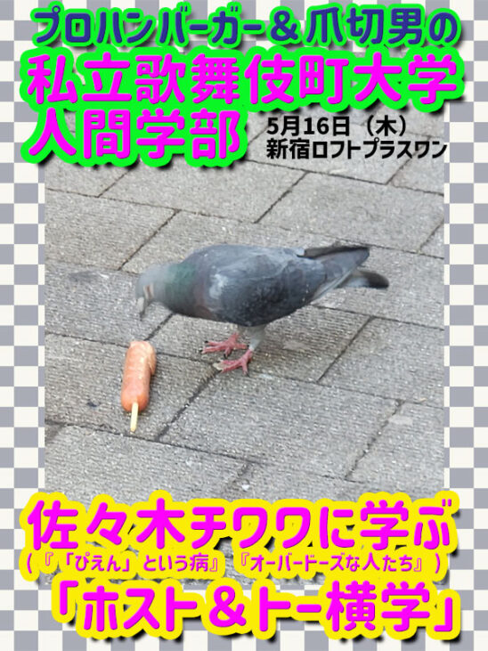 善悪問わず老若男女が集い、さらに外国人観光客がゴジラを撮りまくる今の新宿歌舞伎町。区役所からホスト立ちんぼまでが数百メートルにひしめき合い、ちょっと歩けばゴールデン街に新大久保というまさに人間の坩堝。そんなジャンル問わぬ人間が集う街で、プロハンバーガー&爪切男をホストに、人間のエッジの極みを取材してきた人たちに学びを乞うトークイベント開講!